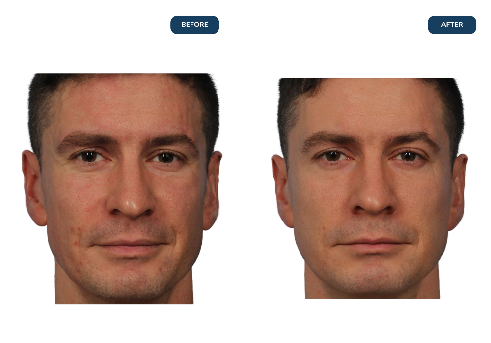 Male patient in his mid-30s after Exion RF Clear treatments targeting cheek pigmentation. The after photo was taken following the second treatment, showing noticeable improvement in skin clarity and a more even skin tone.